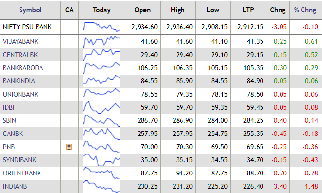 The Nifty PSU Bank index slipped into the red during early morning trade session today, with a majority of the stocks trading with losses. SBI shares slipped 0.14%, while Vijaya Bank gained 0.61%.