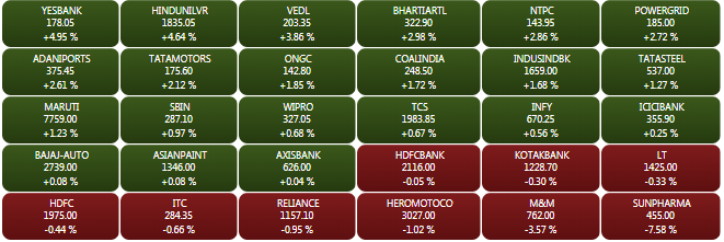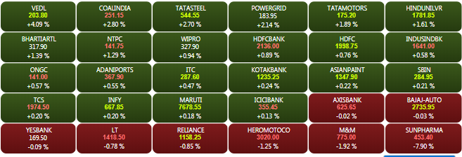 The BSE Sensex closed Monday’s trade 46.70 points or 0.13% higher at 36,241 points. The NSE Nifty was just shy of the 10,900 mark and closed 7 points or 0.06% up at 10,883.75 points. Yes Bank was the top Sensex gainer, while Sun Pharma was the top drag, down 7%. On the NSE, Indiabulls Housing Finance was the top Nifty gainer. The headline indices had opened Monday’s trade in the positive territory on Monday tracking positive global cues.