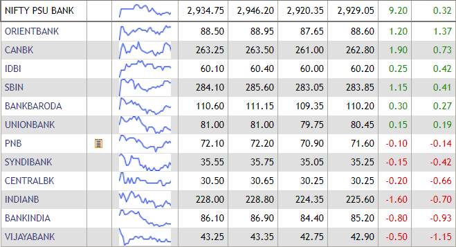 The NIFTy PSU Bank index traded in the postive territory today, with most stocks in the green. SBI shares traded with gains of nearly 1% in opening trade. However, shares of Vijaya Bank, Bank of India, Central Bank of India and PNB traded with losses.