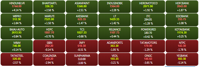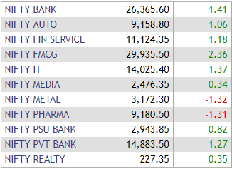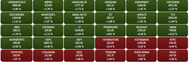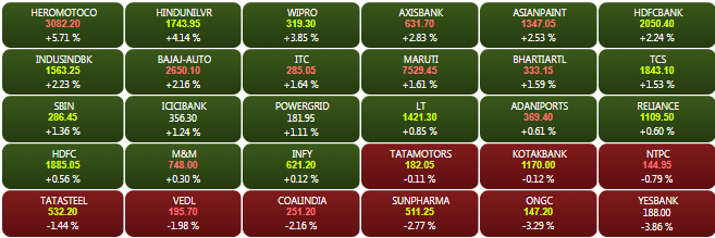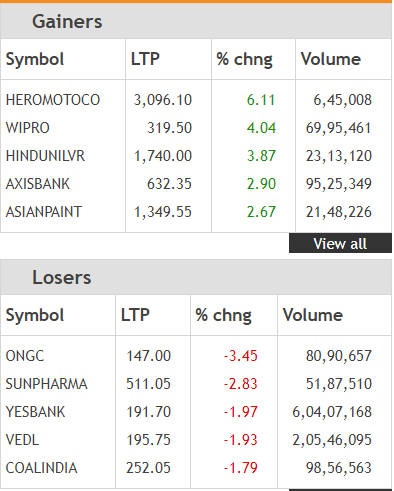 On the NSE, the Nifty FMCG and banking indices were the top sectoral gainers, while the Nifty metals and pharma were the top losers. The Nifty banking index closed higher by 1.41%. Hero MotoCorp, Wipro, HUL, Axis Bank and Asian Paints were the top Nifty gainers, while ONGC, Sun Pharma, Yes Bank, Vedanta and Coal India were the top losers.