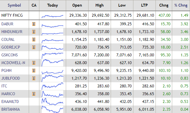 Shares of fast-moving consumer goods (FMCG) companies gained on Monday, with shares of Dabur, HUL and Colgate Palmolive gaining up to 4%. Check all FMCF stocks here: