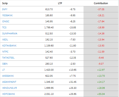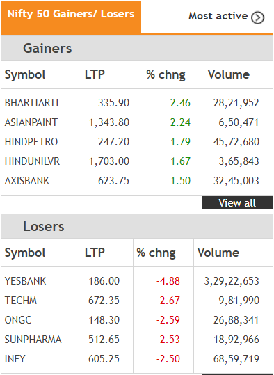 Amid positive global cues, rupee appreciation and a slide in crude oil prices, the NSE Nifty 50 closed Monday's trade on a bullish note. The index closed trade higher by 101.85 points or nearly 1% at 10,628.60points. Check out the top 5 Nifty gainers and losers: