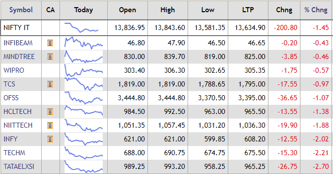 The Nifty IT index traded in the red on Monday on the back of a strong rupee. Rising for the eighth straight day, the rupee climbed 39 paise to 70.30 against the US dollar in early trade Monday, as global crude prices slipped below the $60 per barrel mark.