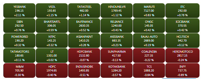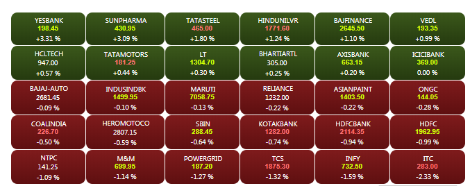 The domestic stock markets –Sensex and Nifty–turned positive in the afternoon trade on Wednesday. Sensex is up about 4 points to 36,448.24, while the Nifty is nearing the 10,950-mark. Sun Pharma shares are trading 3.2% higher at Rs 431.45. Yes Bank shares gained more than 2.4% to Rs 196.75, to emerge among the biggest Sensex gainers. A look at LIVE Sensex heatmap.