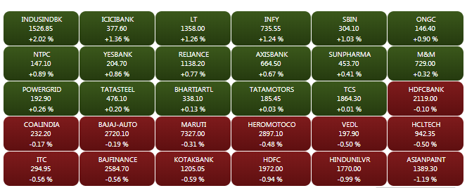 The domestic stock markets –Sensex and Nifty– are trading higher in the afternoon trade, tracking global cues. The Sensex is up about 103 points to 36,421.61, while the Nifty is trading above the 10,900-mark. IndusInd Bank share price gained by more than 2% to Rs 1,526.30, while L&T shares rallied by 1.5% to Rs 1,358.75, to emerge among top Sensex gainers. A look at LIVE Sensex heat map.