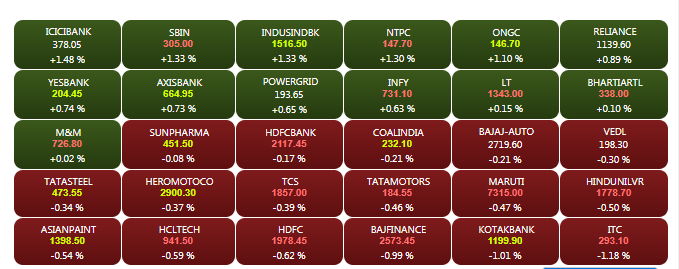 The domestic stock markets --Sensex and Nifty--erased gains in the afternoon trade on Wednesday, on mixed cues. The Sensex ended 2.96 points higher at 36,321.29, while the Nifty closed below the 10,900-mark. Yes Bank shares closed 2.19% higher at Rs 207.40 on the BSE, while IndusInd Bank shares ended 1.86% higher at Rs 1,524.55, to emerge among the biggest Sensex gainers. A look at live Sensex heatmap.