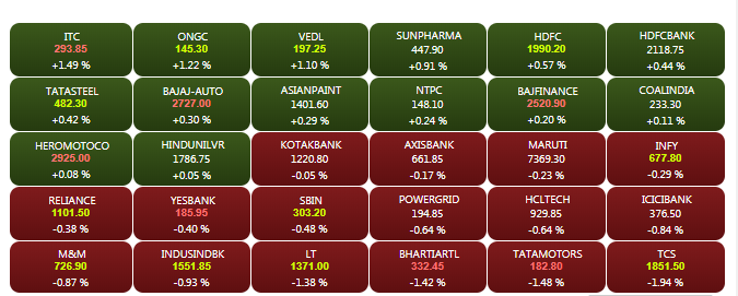 After turning choppy, Sensex and Nifty are extending losses in the afternoon trade on Friday. Sensex is down more than 180.69 points to 35,925.81, while the Nifty is trading below the 10,800-mark. Tata Motors share price slumped by more than 2.8% to Rs 180.50. TCS shares slumped by more than 2.5% to Rs 1,843.25, after the reported Q3 results in line with estimates yesterday. The two Tata Group stocks are among the top losers in Sensex. A look at Sensex heat-map.