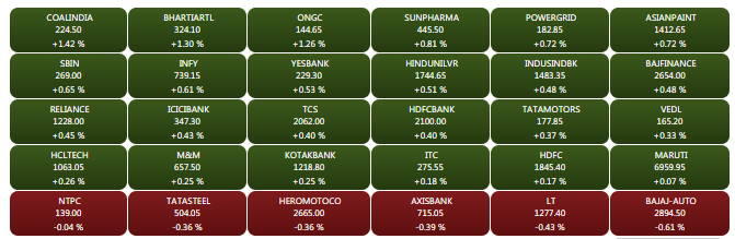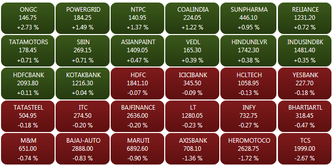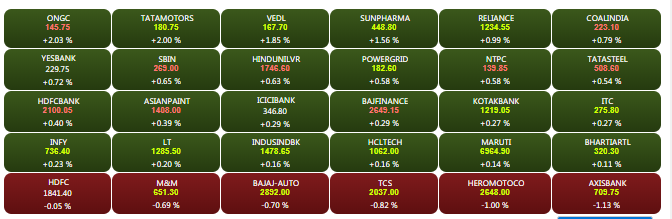 After opening higher on Thursday morning, the stock markets- Sensex and Nifty have receded from day's highs. The Sensex is up about 78 points to 35,983.43, while the Nifty is trading below the 10,850-mark. Shares of Tata Motors are trading 2% higher at Rs 180.60, while ONGC shares are up 145.80 to emerge among the top Nifty gainers. According to stock market experts, the sentiment may remain muted as India-Pakistan geopolitical tensions weigh, impacting the F&O expiry. A look at LIVE Sensex heatmap.