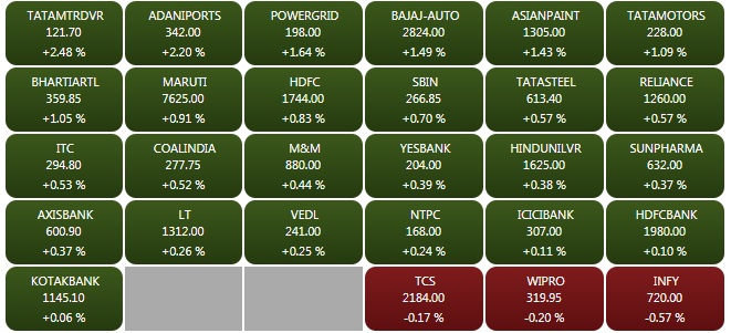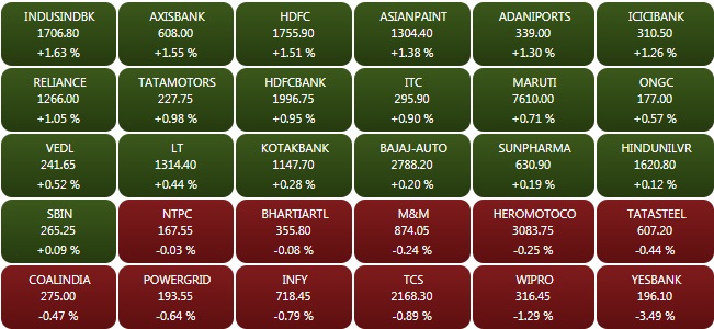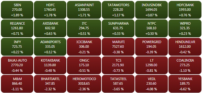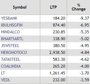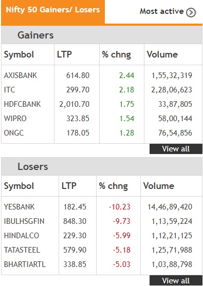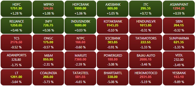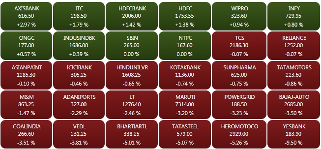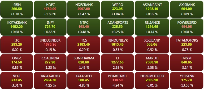 Out of the 30 bluechip companies trading on the BSE, 21 companies traded with losses, including like Yes Bank, Bharti Airtel, Hero MotoCorp, Tata Steel, Coal India, LT, Vedanta, Bajaj Auto, and Maruti Suzuki. HDFC twins, Reliance, Infosys, ITC and Axis Bank gain.