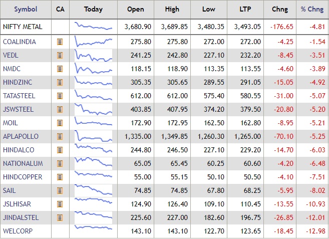 All Nifty Metal stocks were trading with losses during late afternoon trade deals on Friday. Welspun Corp shares fell over 15%. Jindal Steel, which replaced Lupin on the Nifty 50 index today, fell over 12%.