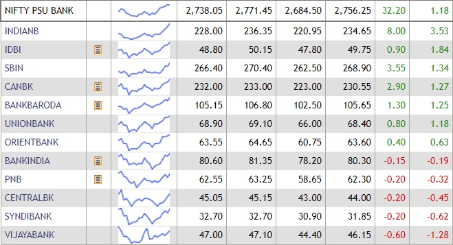 PSU Banks stocks gained in mid-morning trade deals on Friday with shares of Indian Bank, SBI, Canara Bank, IDBI Bank trading in the green. Shares of PNB, Bank of India, Central bank trading with losses.