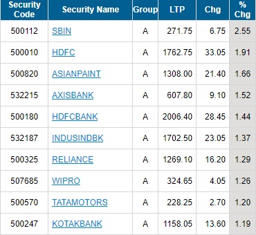 Sbi was the top gainer on the BSE Sensex during pre-noon trade deals, followed by HDFC, Asian Paints, Axis Bank and HDFC Bank. The Sensex recouped from its day's low, jumping over 200 points to a fresh intra-day high of 36,525.30 points, with HDFC twins, Reliance Industries, SBI, ITC and Infosys contributing the most points to the index.