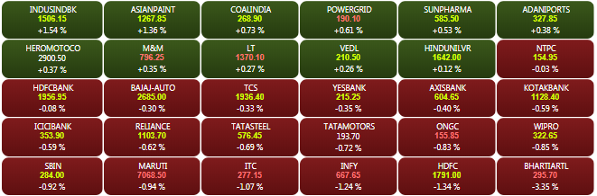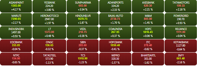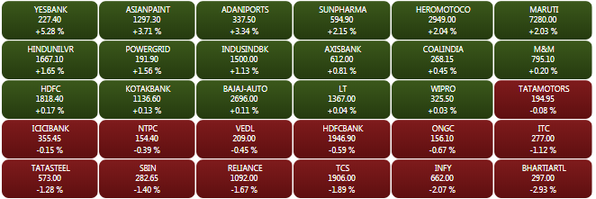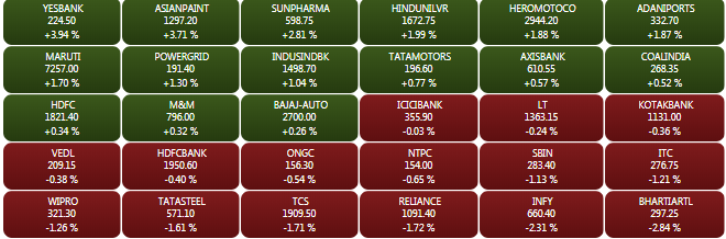 The BSE Sensex recovered over 250 points from its day's low at 35,011.23 points to trade on a flat-to-positive note during the mid-morning trade deals on Friday.  Gains were led by index heavyweights like Asian Paints, Yes Bank, Sun Pharma, Tata Motors, Axis Bank, Adani Ports, and Hero MotoCorp. Infosys was the top loser on the index.