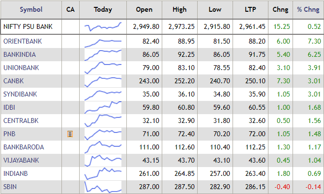 The Nifty PSU Bank index traded in the gree, with shares OBC, Bank of India, Union Bank, Canara Bank and Syndicate Bank leading the gains. SBI waqs the only loser on the index.
