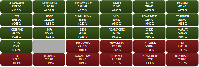 The BSE Sensex closed trade 79.13 points or 0.22% lower at 35,158.55 points. Reliance Industries, Infosys, TCS, ITC, HDFC Bank and SBI together wiped off nearly 200 points from the Sensex. However, the market breadth remained slightly bullish as 1,339 companies advanced compared to 1,199 declines. On the National Stock Exchange, the broader Nifty 50 fell by 13.20 points or 0.12% to end at 10,585.20 points. The Bank Nifty closed 0.13% higher.