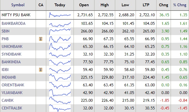 The Nifty PSU Banks index traded with gains during Monday's afternoon session, with shares of Bank of Baroda gaining over 1.6%. BoB shares were followed by gains in SBI, PNB, Union Bank. Syndicate Bank, Bank of India and IDBI shares. Central Bank of India shares was down 1.45%.