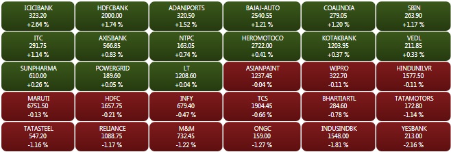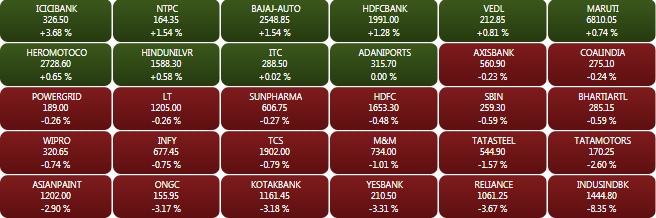 The NSE Nifty closed Monday’s trade at 10,245.25 points, down 58.30 points or 0.57%. Except for the auto and financial services indices, all other Nifty sectoral indices ended in the negative territory. Asian Paints fell 3% ahead of Q2 results announcement. The market breadth remained bearish on the National Stock Exchange as 16 Nifty companies advanced as compared to 33 declines.