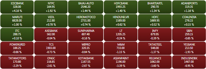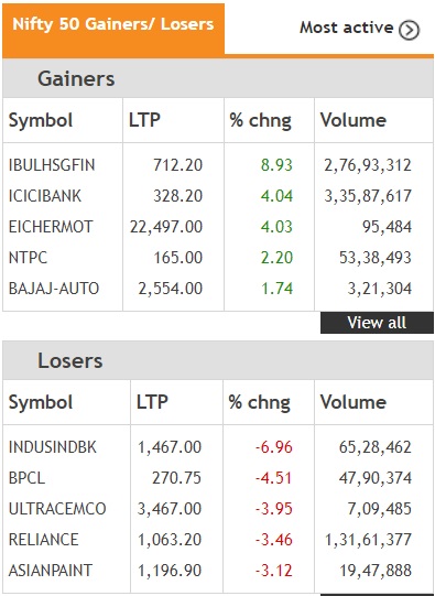 The NSE Nifty, which opened above the 10,400-level, closed Monday's trade 58.30 points or 0.57% points lower at 10,245.25 points. Reliance Indutries was the top index drag and wiped off over 30 points from the Nifty index. Check out the top five gainers and losers on the NSE on Monday: