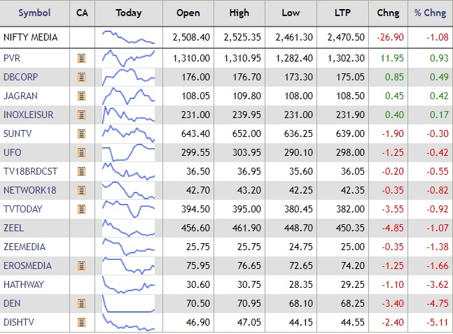 The Nifty media index dropped over 1% on Monday, with shares of Dish TV, Den Networks and Hathway Cables falling up to 5% in mid-morning trade deals. In contrast, PVR shares rose by 0.93%.