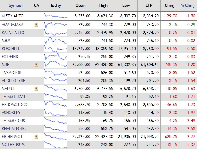 The NSE Nifty AUto index hit a fresh 52-week low on Thursday amid a sector-wide sell-off in the domestic equity markets. Motherson Sumi Systems was the top drag, followed by shares of Eicher Motors, Bharat Forge, Tata Motors and Ashok Leyland.