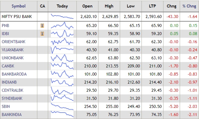 The Nifty PSU bank index traded with loses on Thursday. SBI shares fell over 2%, followed by Syndicate Bank (-1.11%), Central Bank (-1.01%), Indian Bank (-0.97%) and Bank of Baroda (-0.83%). Bank of India shares traded down by 2.11%.