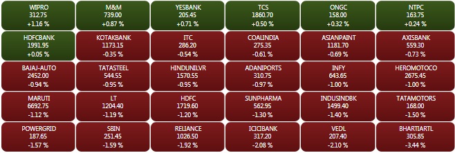 The BSE Sensex closed Thursday’s trade lower by 343.87 points or 1.01% at 33,690.09 points. Index heavyweights HDFC, Reliance Industries, HDFC Bank, Bharti Airtel, SBI, ICICI Bank, LT, Sun Pharma and Vedanta wiped off nearly 300 points from the headline index. The BSE market breadth was bearish, with 1,569 declines and 937 advances. The BSE mid-cap index closed 0.58% and the small-cap index ended 0.98% lower. Bharti Airel was the top index loser, closing nearly 7% lower.