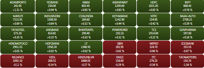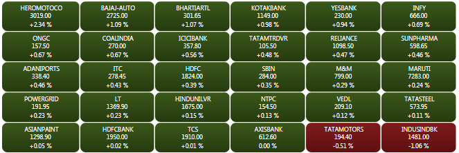 Sensex and Nifty opened in the positive territory on Monday led by gains in shares of blue-chips like HDFC, Asian Paints, Infosys, Adani Ports and M&M. Tata Motors shares slipped over 2% in opening trade today, while Titan Company shares rose 2.3%.