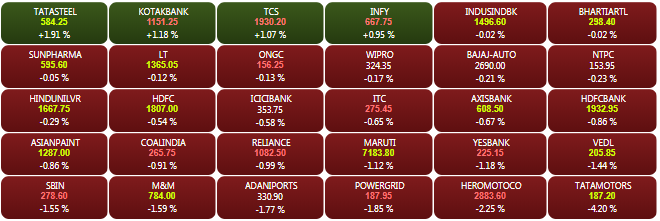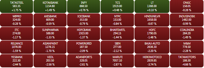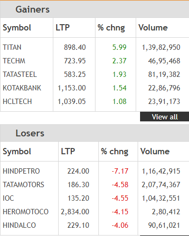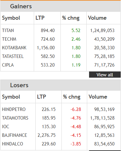 The NSE Nifty 50 closed below the 10,500-mark at 10,482.20 points, down 103 points or 0.97% led by selling pressure in all sectoral indices barring the IT index. The Nifty BAnk index ended 0.90% lower. Titan, Tech Mahindra, Tata Steel, Kotak Bank, and HCL Technologies were the top gainers on the Nifty, while HPCL, Tata Motors, IOC, Hero MotoCorp and Hindalco were the top index losers.