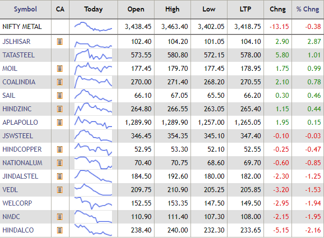The Nifty metal index was trading lower by 0.38% in trade today. Hindalco was the top index loser, down 2.16%. Check out all gainers and losers on the metals index here: