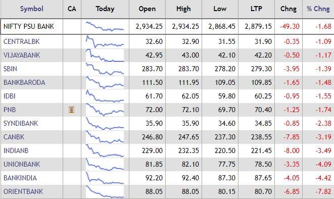 PSU Banks came under heavy selling pressure in the early afternoon trade deals on Monday. Shares of OBC, Bank of India and Union Bank fell up to 7% on the PSU Bank index. SBI shares were trading lower by 1.4%.