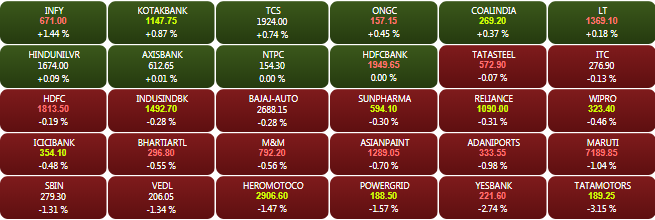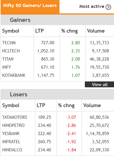 The NSE Nifty closed Monday's trade at 10,482.20 points, down 103 points or 0.97%, led by losses in all the sectoral indices barring the IT index. The India VIX rose 8.64% to 19.30. Check out the top Nifty gainers and losers today: