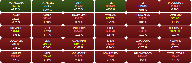 The BSE Sensex closed Monday's trade 345.56 points or 0.98% lower at 34,812.99 points tracking weakness in the rupee, along with rising crude prices and heavy selling pressure in blue-chip stocks. The NSE Nifty 50 ended below the 10,500-mark led by profit booking in most PSU banks, auto, realty and financial services stocks. Check the top gainers and losers on the Sensex here: