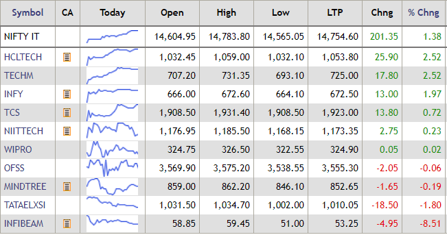 The NSE Nifty IT index traded with gains of over 1% in early morning trade on Monday as the rupee weakened. In opening trade, the rupee slipped by 26 paise to 72.76 against the US dollar owing to increased demand for the American currency from importers amid increasing global crude oil prices. Infibeam shares dropped over 8%.