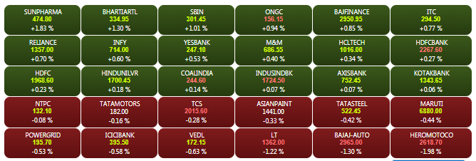 The Sensex and Nifty opened marginally higher on Tuesday, tracking global cues. The Sensex is up about 60 points to 38,158.63, while the Nifty is trading near the 11,450-mark. Shares of Anil Ambani-led Reliance Communications surged 10% on Tuesday afternoon to Rs 4.40, after a statement confirmed that RCom has made a payment of Rs 550 crore and interest thereon to Ericsson, in compliance of the judgement of the Supreme Court. Anil Ambani faced a possible jail term of three months, if his RCom failed to pay Ericsson by today, per a Supreme Court order. A look at LIVE Sensex heatmap.