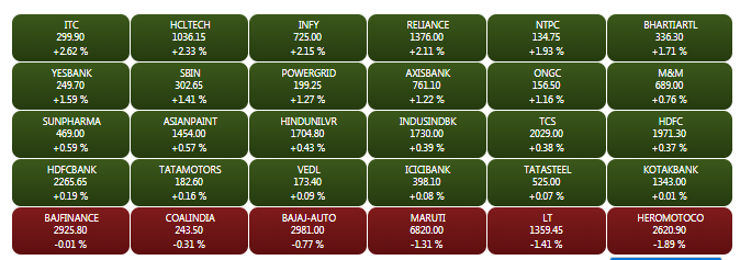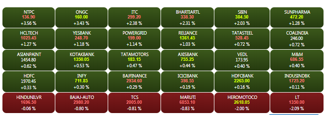After opening marginally higher, the Sensex and Nifty extended gains in the afternoon trade on Tuesday. The Sensex is up 172 points to 38,266.84, while the Nifty is trading above the 11,500-mark. ITC shares are trading 2.6% higher at Rs 299.70, while NTPC stock is trading 3.7% higher at Rs 137.05 on NSE. L&T shares are trading 2.1% lower at Rs 1,350.25, on Mindtree acquisition buzz. A look at LIVE Sensex heatmap.