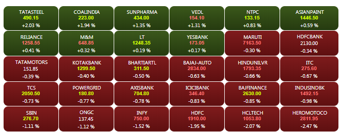 The domestic stock markets-- Sensex and Nifty-- extended losses in the afternoon trade on Tuesday, tracking weak global cues. The Sensex is down 220 points to 36,174.34, while the Nifty is trading below the 10,850-mark. HCL Tech, HDFC shares slumped by more than 1.5% each to merge among the biggest losers in the Sensex. A look at LIVE Sensex heatmap.