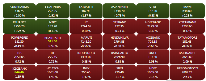 The domestic stock markets-- Sensex and Nifty-- opened lower on Tuesday morning, tracking weak global cues. The Sensex is down about 50 points to 36,340.56, while the Nifty is trading below the 10,900-mark. Axis Bank shares slumped 1.5% to Rs 700 after the Specified Undertaking of Unit Trust of India's offer for sale to sell up to 5 crore shares of the lender. Eicher Motors shares tanked by more than 3.3% to Rs 20,070 in the morning trade on Tuesday. A look at LIVE Sensex heatmap.