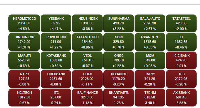 The headline indices Sensex and Nifty opened lower on Wednesday morning, tracking global cues. The Sensex is down 155 points to 37,241, while the Nifty is trading near the 11,000-mark. Axis Bank, Tech Mahindra shares are among the biggest losers, shedding more than 3% each. Heromotocorp, Bharti Airtel are among the major gainers, jumping more than 1% each. A look at LIVE Sensex heatmap.