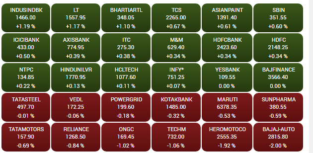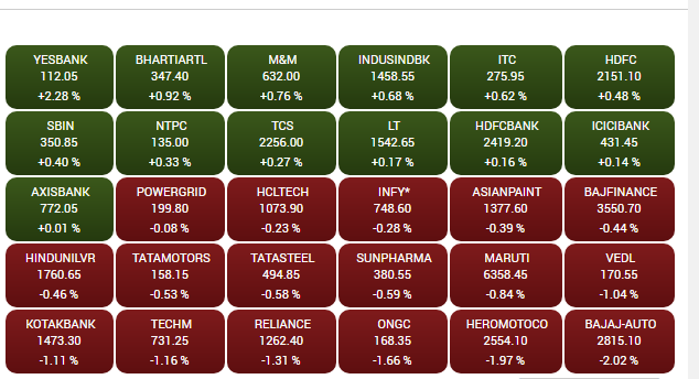 The major gainers on BSE are Yes Bank, M&M and TCS, while the losers are Vedanta, Tata Steel, Bajaj Auto and ONGC. Barring PSU Bank and FMCG, all the sectoral indices ended in red on NSE.