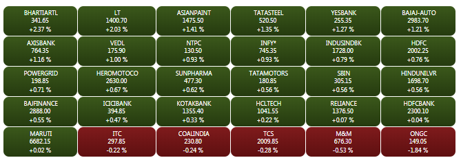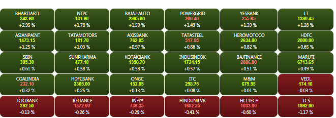 The Sensex and Nifty opened marginally higher on Friday morning, helped by gains in financial stocks. The Sensex is up about 130 points to 38,516.07, while the Nifty is trading above the crucial 11,500-mark. Bharti Airtel shares gained more than 2% to Rs 342.10 on BSE, while Yes Bank shares jumped more than 1.5% to Rs 257 to emerge among the top Sensex gainers. A look at LIVE Sensex heatmap.