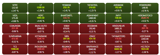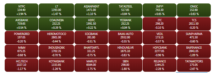 The Sensex and Nifty have reversed gains from the morning trade on Friday, amid sell-offs in bluechip stocks. The Sensex is down about 80 points to 38,307.45, while Nifty is trading below the 11,500-mark. NTPC shares jumped by more than 3% to 140.05, while L&T shares are trading 2% higher at Rs 1,297.20. HCL Tech shares are trading 1.6% lower at Rs 1,022, while Maruti Suzuki shares are trading 1.2% lower at Rs 6600 on BSE. A look at LIVE Sensex heatmap.