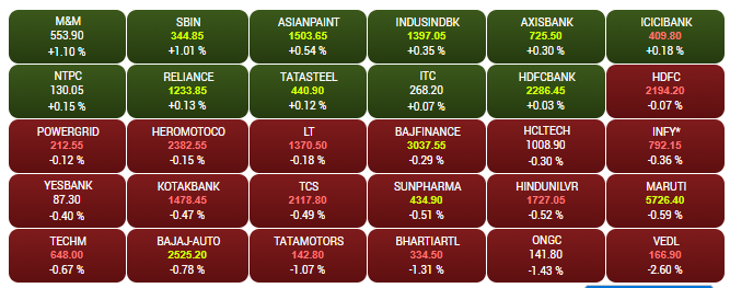 The headline indices Sensex and Nifty opened marginally lower, tracking global cues. The Sensex is down 50 points to 37,779, while the Nifty is trading below the 11,250-mark. VEDL, Bajaj Auto shares are among the biggest losers, shedding up to 3%. IndusInd Bank, M&M shares are among the biggest gainers, jumping up to 3%. A look at LIVE Sensex heatmap.
