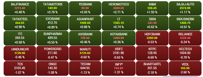 After opening lower, the headline indices Sensex and Nifty made a recovery in the afternoon trade on Friday. The Sensex up 62 points to 37,893, while the Nifty is trading near the 11,300-mark. Bajaj Finance, Yes Bank, IndusInd Bank, M&M shares are among the biggest gainers, jumping up to 10%. VEDL, Bharti Airtel are among the top losers, shedding more than 2% each. A look at LIVE Sensex heatmap.