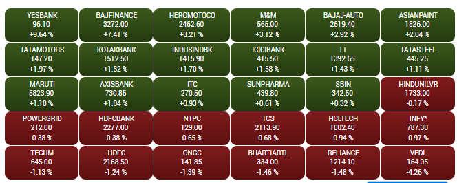After opening lower, the headline indices Sensex and Nifty made a recovery in the afternoon trade on Friday given in rally in financial heavyweights. The Sensex ended 52 points up 37,882.79, while the Nifty ended below the 11,300-mark. Bajaj Finance, Yes Bank, Heromotocorp shares were among the biggest gainers, jumping up to 10%. VEDL, HDFC, Bharti Airtel were among the top losers, shedding up to 5%. A look at LIVE Sensex heatmap.