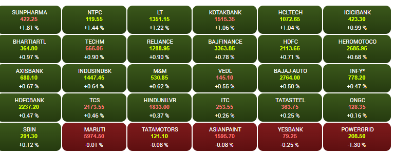 The headline indices Sensex and Nifty closed marginally higher on Monday afternoon, tracking global cues. The Sensex ended 53 points up at 37,402.49, while the Nifty ended above the 11,050-mark. Sun Pharma, Tech Mahindra shares were among the biggest gainers, jumping up to 2.60%. Yes Bank, Powergrid, ONGC shares were among the biggest losers, shedding up to 3.5%. A look at LIVE Sensex heatmap.
