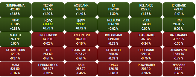 The headline indices Sensex and Nifty closed marginally higher on Monday afternoon, tracking global cues. The Sensex ended 53 points up at 37,402.49, while the Nifty ended above the 11,050-mark. Sun Pharma, Tech Mahindra shares were among the biggest gainers, jumping up to 2.60%. Yes Bank, Powergrid, ONGC shares were among the biggest losers, shedding up to 3.5%. A look at LIVE Sensex heatmap.