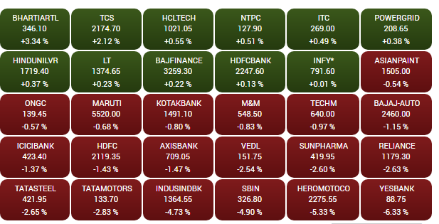 The Sensex was down by 289 points or 0.77% at 37397.24, and the Nifty by 103.80 points or 0.93% at 11085.40 because of weakness in Reliance, Banks and few pharmaceutical companies. About 350 shares have advanced, 1412 shares declined. Advance decline ratio was lowest after 8th July 2019 and 19th July 2019. Nifty closed below the level of 200 days SMA, which was at 1140. It shows that market participants are under fear as they have not even respected the long term average of Nifty closing prices. Bank Nifty was down by 800 points from its peak of 29530 mainly on the back of weakness in PSU banks, Yes bank, IndusInd Bank and RBL Bank. Tomorrow will be a crucial day for markets as the outcome on interest rates from Federal Reserve would decide the trend of global liquidity. The market is turning attractive in the medium term as even though frontline stocks are down nearly by 15% to 20%. Pessimism is increasing amongst major players, said Kotak Securities.