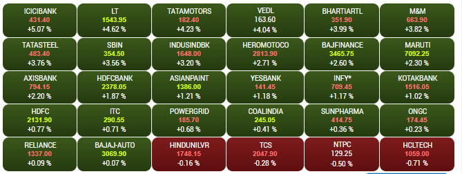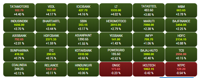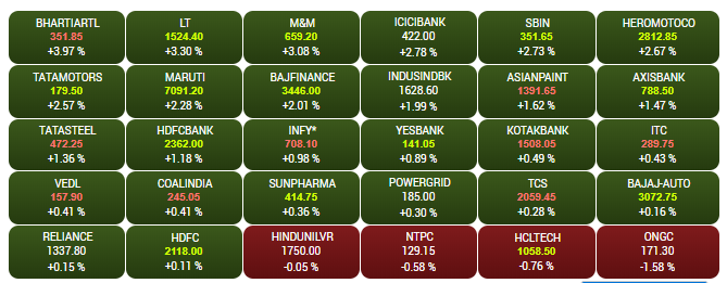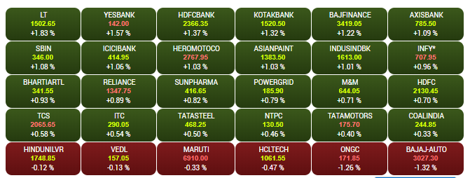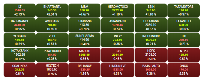 The Sensex and Nifty are opened higher on Friday morning, after Narendra Modi-led NDA’s emphatic win in polls. The Sensex is up 400 points to 39,212.47, while the Nifty is trading above the 11,750-mark. Shares of L&T, Yes Bank have emerged as top gainers, jumping up to 2.5%. A look at LIVE Sensex heatmap.
