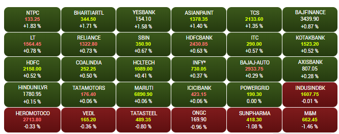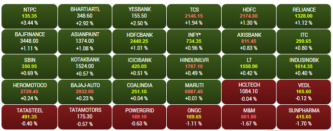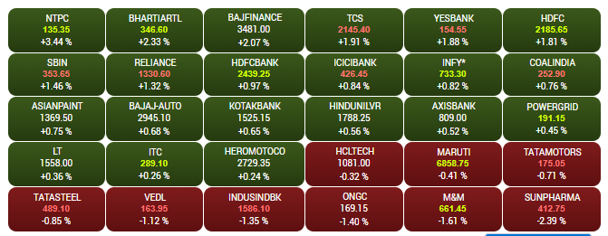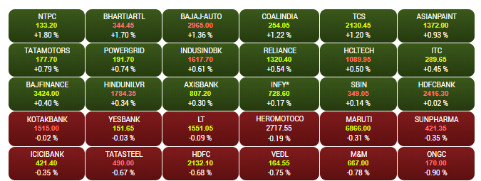After opening higher, the Sensex and Nifty extended gains in the afternoon trade on Thursday. The Sensex ended 330 points higher at 39,831.92, while the Nifty closed near the 11,950-mark. NTPC, Bharti Airtel shares were the biggest Sensex gainers jumping more than 3% each. Sun Pharma, M&M shares were among the biggest losers in the 30-share index. A look at LIVE Sensex heatmap.