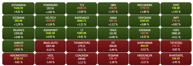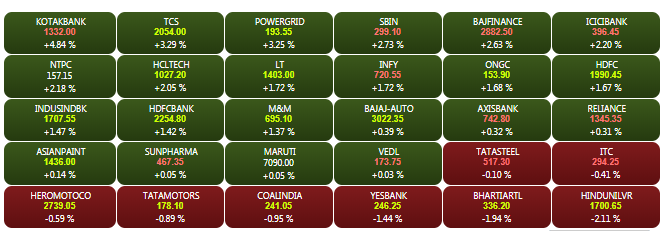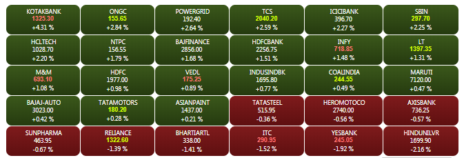 The stock markets- extended rally on Friday led by strong gains in private bank stocks. The Sensex closed 269 points up at 38,024, while Nifty is ended above the 11,400-mark. Kotak Mahindra Bank shares closed 4.4% higher at Rs 1,327.10, while Powergrid shares ended 2.6% higher at Rs 192.40. IT major TCS shares closed the session 2.4% higher at Rs 2,036.15. A look at LIVE Sensex heatmap.
